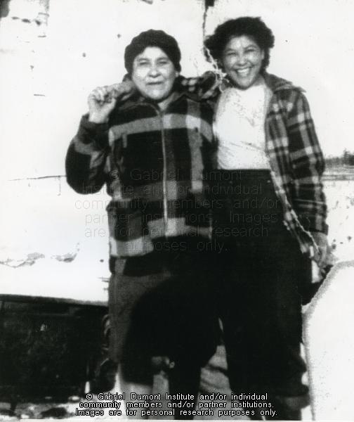 Mary Ann Laliberte (née Aubichon) (left), wife of Little Joe Laliberte, and Madeline Laliberte, daughter of Goodwin Majeau Laliberte and Rosa Merasty. Mary Ann Laliberte (née Aubichon) died in 1975 at the age of 78. This image is to be used for research purposes only. The reproduction of this image in whole or in part is strictly prohibited without the permission of the copyright holder. Copyright for this image belongs to Lawrence Arnault, and/or the person(s) in the photograph, and/or their descendants. |