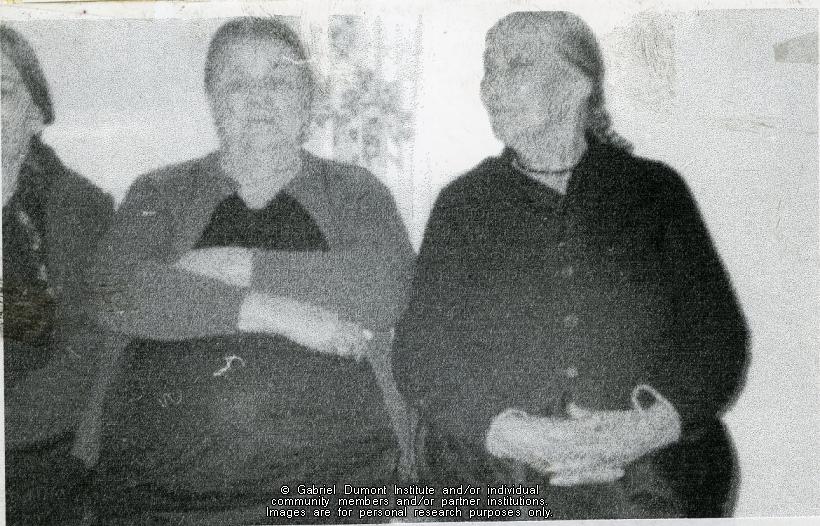 Ernestine (Squeesis) Daigneault (née Laliberte) (left) and her sister Annie (Tsits) Durocher (née Laliberte), daughters of Louis (Petit Roy) Laliberte and Virginia Merasty. This image is to be used for research purposes only. The reproduction of this image in whole or in part is strictly prohibited without the permission of the copyright holder. Copyright for this image belongs to Lawrence Arnault, and/or the person(s) in the photograph, and/or their descendants. |
