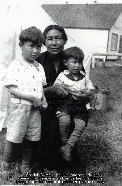 Philomene Chariter with sons Martin, left, and Dominique, right. This photograph was taken in Ile-a-la-Crosse, SK in June of 1942. This image is to be used for research purposes only. The reproduction of this image in whole or in part is strictly prohibited without the permission of the copyright holder. Copyright for this image belongs to Lawrence Arnault, and/or the person(s) in the photograph, and/or their descendants. |