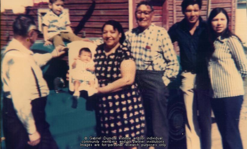 Left to right: Bill Lafleur, Bella Lafleur, John (Tsi-Jean) Merasty, Edwin Lafleur and his wife. This is probably a five generation photograph. The two small children would be the great, great-grandchildren of John Mersasty. This image is to be used for research purposes only. The reproduction of this image in whole or in part is strictly prohibited without the permission of the copyright holder. Copyright for this image belongs to Lawrence Arnault, and/or the person(s) in the photograph, and/or their descendants. |
