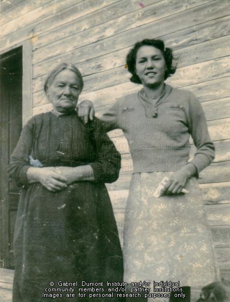 Lucia Merasty stands with her granddaughter Alice McKay. Lucia was the daughter of Francois Maurice and Angelle Laliberte of Ile-a-la Crosse, SK. Francois was originally from Quebec. This image is to be used for research purposes only. The reproduction of this image in whole or in part is strictly prohibited without the permission of the copyright holder. Copyright for this image belongs to Lawrence Arnault, and/or the person(s) in the photograph, and/or their descendants. |