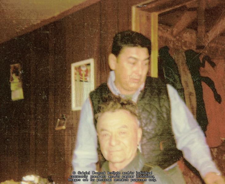 Seated is Narcisse Merasty, a son of Baptiste Merasty and Lucia Maurice. Behind him is his nephew Harvey Roy. This image is to be used for research purposes only. The reproduction of this image in whole or in part is strictly prohibited without the permission of the copyright holder. Copyright for this image belongs to Lawrence Arnault, and/or the person(s) in the photograph, and/or their descendants. |