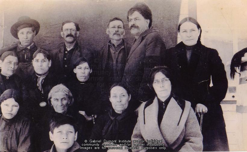 Decendants of Raphael Morin Sr. Back row, left to right: Unknown, Unknown, Raphael Morin Jr., Alex DeLaronde and Agnes Morin, married to Alex DeLaronde. Middle row, left to right: DeLaronde who was married to a Morin, most likely Judille, next two are unknown. Front row, left to right: unknown, possibly Sophie Morin (a sister of Raphael Sr.), Caroline Morin (married to Frances Roy Jr.) and unknown. The young boy in the front is also unknown. This image is to be used for research purposes only. The reproduction of this image in whole or in part is strictly prohibited without the permission of the copyright holder. Copyright for this image belongs to Lawrence Arnault, and/or the person(s) in the photograph, and/or their descendants. |