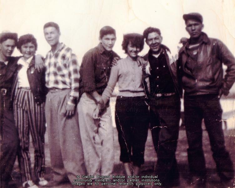 Left to right: Johnny Roy, Georgina Merasty, Wilfred Merasty, Peter Merasty, Delia Merasty, Baptiste Arcand and Patrick (Patty) Merasty. This image is to be used for research purposes only. The reproduction of this image in whole or in part is strictly prohibited without the permission of the copyright holder. Copyright for this image belongs to Lawrence Arnault, and/or the person(s) in the photograph, and/or their descendants. |