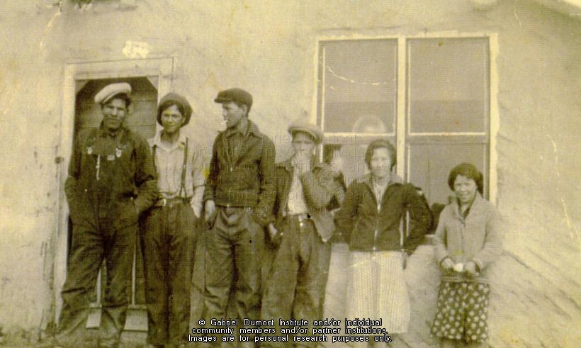 Left to right: Ernie Aubichon, Bernard Laliberte, Marcelin Laliberte, Gilbert (Pockets) Laliberte, Theresa Desjarlais (future wife of Vital Morin of Ile-a-la Crosse, SK) and Mary Laliberte (to marry a Fulton). This picture was taken before 1946. This image is to be used for research purposes only. The reproduction of this image in whole or in part is strictly prohibited without the permission of the copyright holder. Copyright for this image belongs to Lawrence Arnault, and/or the person(s) in the photograph, and/or their descendants. |