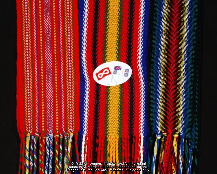 | Description: | Union nationale metisse Saint-Joseph du Manitoba sash flanked by two other sashes.
