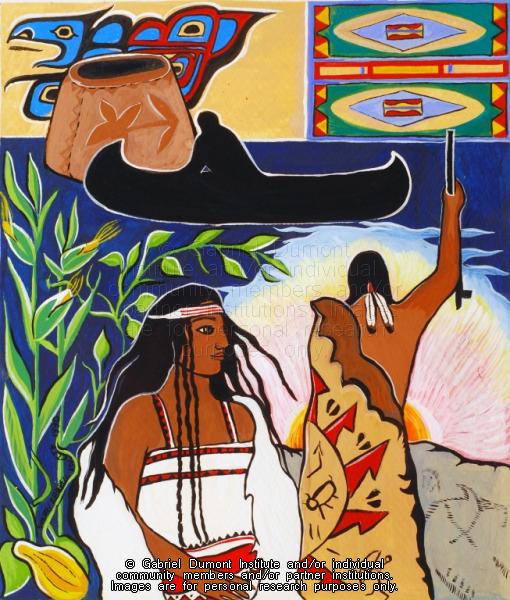 Description: Photograph of an original panel from Sherry Farrell Racette’s “The Flower Beadwork People.” This item is part of Gabriel Dumont Institute’s museum collection.