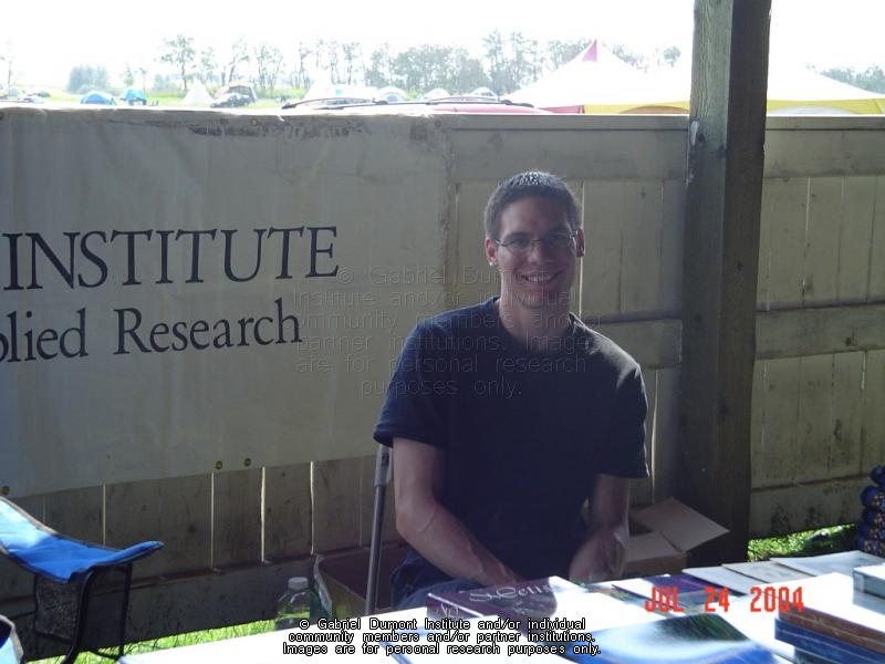 | Description: | David Morin at Gabriel Dumont Institute display table, Back to Batoche, 2004.