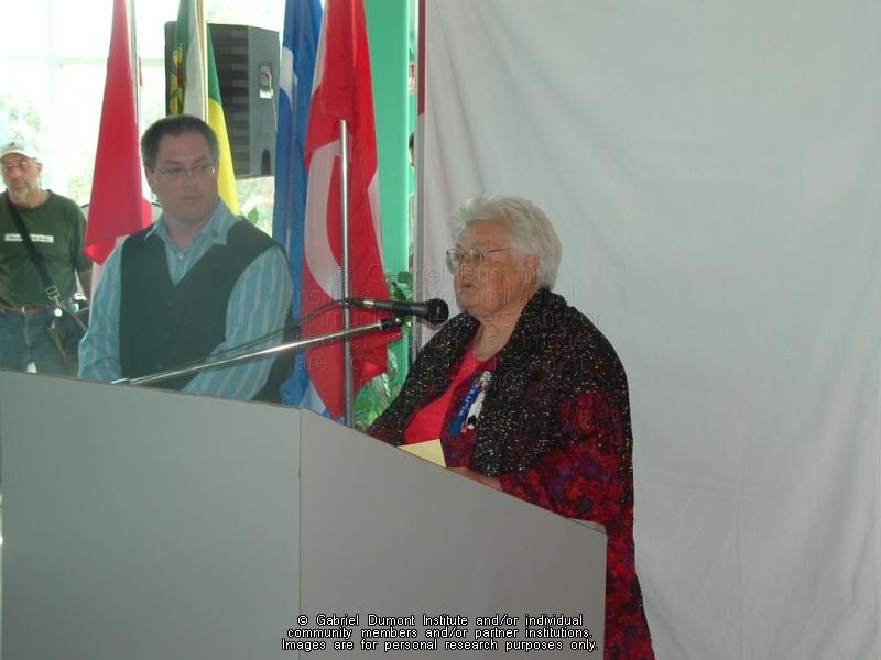 | Description: | Elder Rose Fleury at podium, Back to Batoche, 2006, unveiling of a billiards table attributed to Gabriel Dumont.