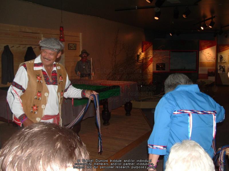 Bruce Dumont and Audrey Poitras untying sash to open exhibit to a billiards table attributed to Gabriel Dumont, Back to Batoche, 2006.