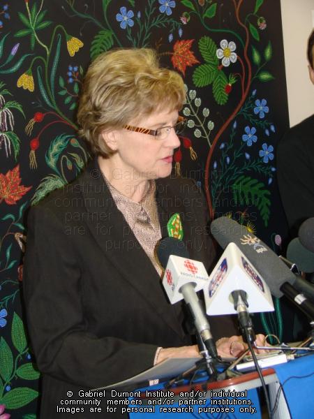 | Description: | Member of Parliament Carol Skelton at the Michif funding announcement for the Gabriel Dumont Institute, January 3, 2008. |