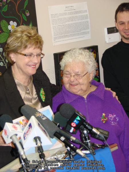 | Description: | Member of Parliament Carol Skelton and Elder Dorothy Aubichon at the Michif funding announcement for the Gabriel Dumont Institute, January 3, 2008. Geordy McCaffrey in corner of photograph as well. |