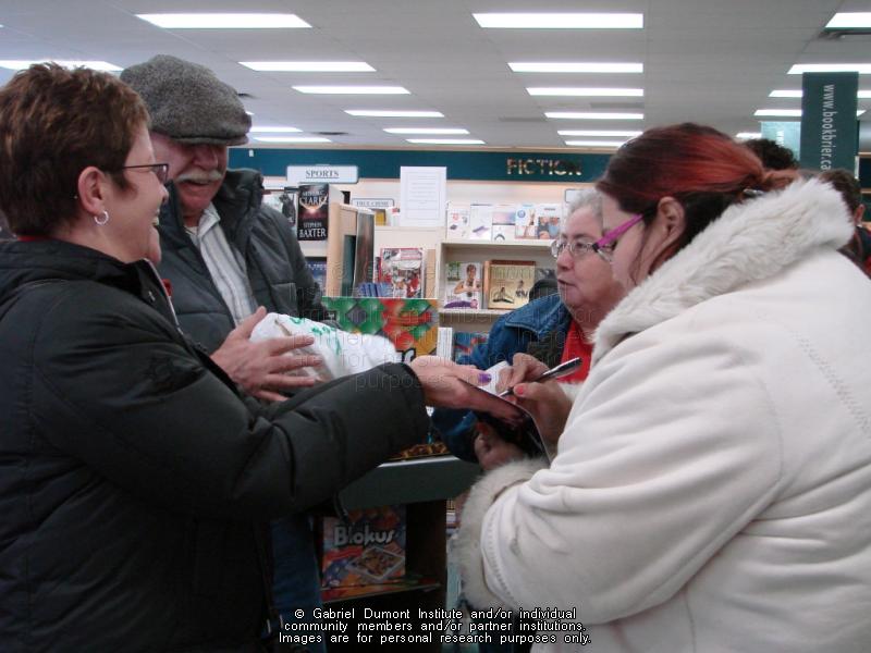 | Description: | Carrie Saganace signing a copy of Stories of Our People: A Métis Graphic Novel Anthology at book launch. |