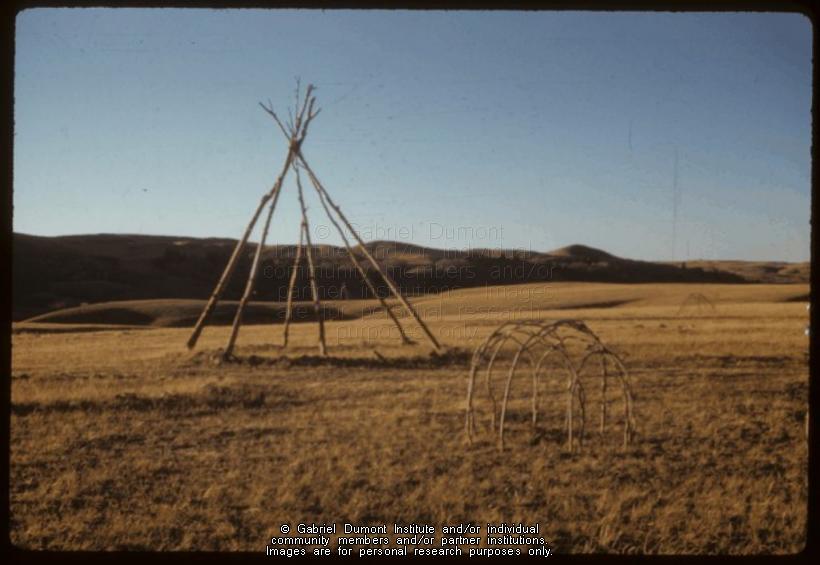 Sweat house frames and teepee. This image has been graciously provided by the Saskatchewan History and Folklore Society, through executive director Finn Andersen, for use on this website, and is to be used for research purposes only. The reproduction of this image in whole or in part is strictly prohibited without the permission of the copyright holder. |