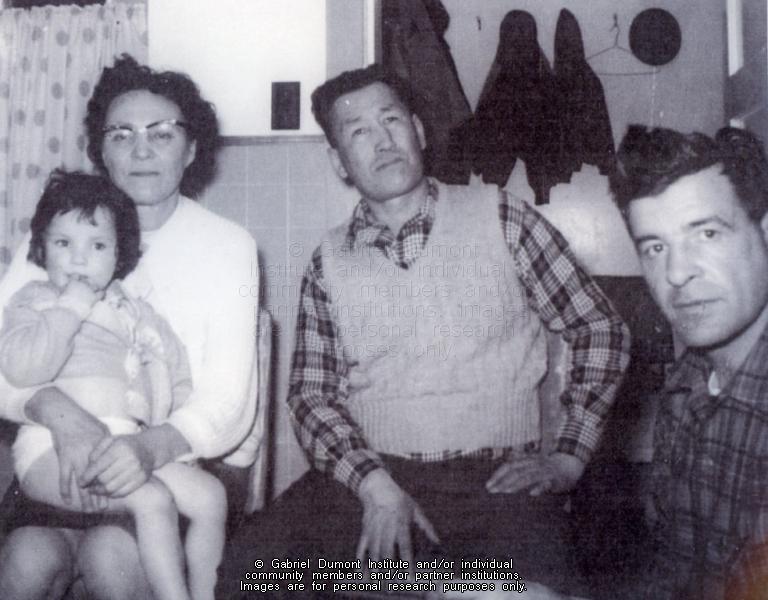 The young girl is Georgina Sinclair being carried by Victoria (Bebe) Sinclair. The two men are Alex Desjarlais and Jake Kulchynski. This image is to be used for research purposes only. The reproduction of this image in whole or in part is strictly prohibited without the permission of the copyright holder. Copyright for this image belongs to Lawrence Arnault, and/or the person(s) in the photograph, and/or their descendants. |