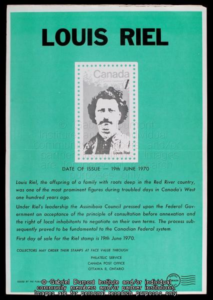 This image (by Peter Beszterda) is date of issue letter for the Louis Riel stamp that was produced by Canada Post in 1870.It is part of the Dennis and Jean Fisher Collection. This item was donated to the Institute by Dennis and Jean Fisher in 2011. This collection contains archaeological artifacts taken from the battlefields of the 1885 Resistance as well as Fort Pitt (Saskatchewan), Cumberland House (Saskatchewan) and St. Peter’s Mission, Montana. The collection also includes various artifacts and ephemera relating to the 1885 Resistance and Gabriel Dumont.