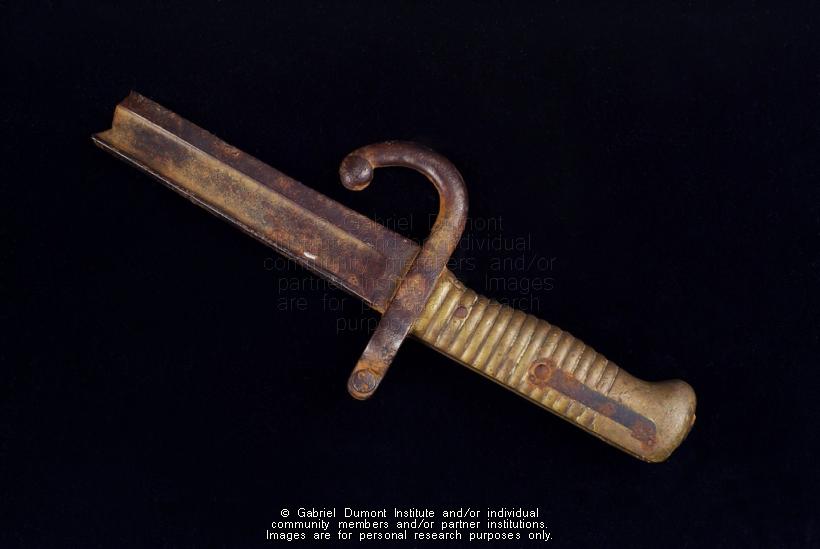 Description: This image (by Peter Beszterda) is of an 1866 Chassepot French-made bayonet (c. 1866-1874) that was used on an 11 mm Chassepot rifle. Dennis Fisher bought this artifact from a First Nations man from the Poundmaker First Nation in the 1970s. The man claimed that he found the bayonet fragment from Cutknife Hill, the scene of the Battle of Cuknife Hill (May 2, 1885). It is part of the Dennis and Jean Fisher Collection. This collection contains archaeological artifacts taken from the battlefields of the 1885 Resistance as well as Fort Pitt (Saskatchewan), Cumberland House (Saskatchewan) and St. Peter’s Mission, Montana. The collection also includes various artifacts and ephemera relating to the 1885 Resistance and Gabriel Dumont.