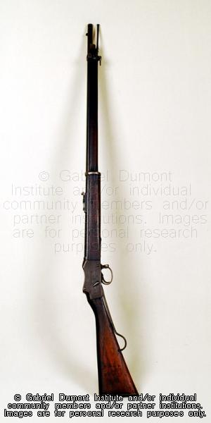 This image (by Peter Beszterda) is of a .577/.450 Martini-Henry Rifle. This type of rifle was used by the North West Field Force during the 1885 Resistance. It was donated to the Institute in 2011 by Dennis and Jean Fisher. It is part of the Dennis and Jean Fisher Collection. This collection contains archaeological artifacts taken from the battlefields of the 1885 Resistance as well as Fort Pitt (Saskatchewan), Cumberland House (Saskatchewan) and St. Peter’s Mission, Montana. The collection also includes various artifacts and ephemera relating to the 1885 Resistance and Gabriel Dumont. |