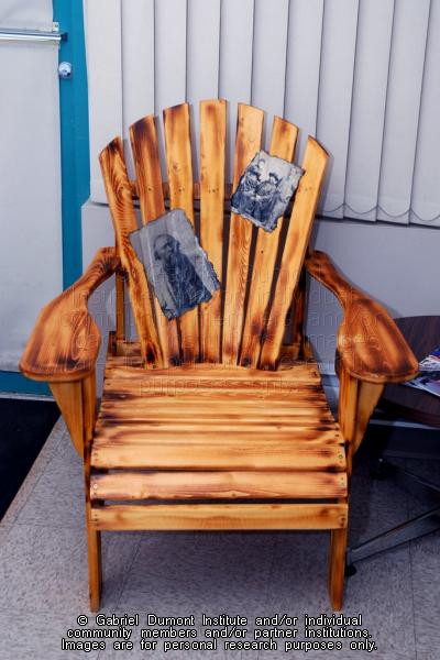 This image is of a Muskoka or Adirondack chair with two historical images of Métis leader, Gabriel Dumont. It was made by a local artisan and were displayed at Batoche National Historic Site before being acquired by the Gabriel Dumont Institute. |