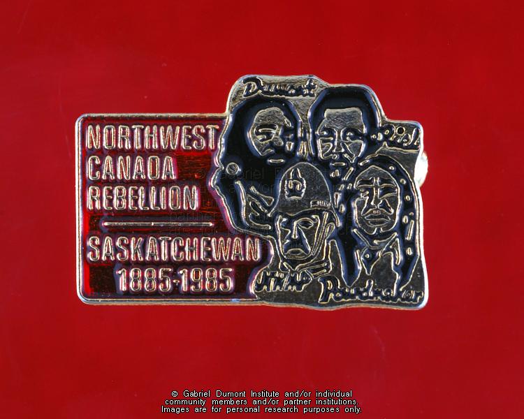 This image (by Peter Beszterda) is of a Northwest Canada Rebellion, Saskatchewan, 1885-1985 Steel Collector Pin. It is part of the Dennis and Jean Fisher Collection. This collection contains archaeological artifacts taken from the battlefields of the 1885 Resistance as well as Fort Pitt (Saskatchewan), Cumberland House (Saskatchewan) and St. Peter’s Mission, Montana. The collection also includes various artifacts and ephemera relating to the 1885 Resistance and Gabriel Dumont. |
