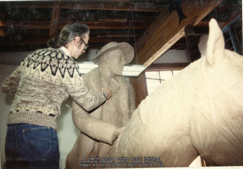 | Description: | In 1984, Saskatoon-based sculptor Bill Epp (brown sweater, pony tail) was commissioned by the Commemorate `85 corporation to sculpt a statue of Gabriel Dumont. In these photographs, Bill Epp (grey sweater) is working on the Gabriel Dumont statue in his workshop in February 1985. Still in plaster, the statue was awaiting casting in bronze at a nearby foundry. The statue was taken to Saskatoon from New Mexico to be unveiled during a special tribute to Gabriel Dumont on May 6, 1985. Later, the statue was taken to the Dumont family reunion at Duck Lake, and was later presented to Saskatoon City Hall on May 14, 1985.