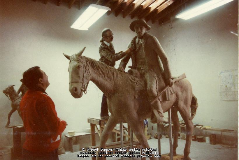 | Description: | In 1984, Saskatoon-based sculptor Bill Epp (brown sweater, pony tail) was commissioned by the Commemorate `85 corporation to sculpt a statue of Gabriel Dumont. In these photographs, Bill Epp (grey sweater) is working on the Gabriel Dumont statue in his workshop in February 1985. Still in plaster, the statue was awaiting casting in bronze at a nearby foundry. The statue was taken to Saskatoon from New Mexico to be unveiled during a special tribute to Gabriel Dumont on May 6, 1985. Later, the statue was taken to the Dumont family reunion at Duck Lake, and was later presented to Saskatoon City Hall on May 14, 1985.
