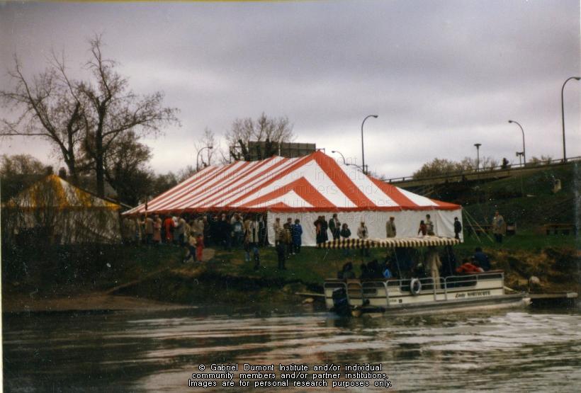 | Description: | In this image, special guests are travelling by boat to attend a ceremony honouring Gabriel Dumont. On May 6, 1985, there was a ceremony to honour Gabriel Dumont in Saskatoon. Events included the unveiling of the Gabriel Dumont stamp and first-day cover by Canada Post, the dedication of the Gabriel Dumont Statue and Park, jigging and square dancing by the Gabriel Dumont Dancers, and the official opening of the Marr Residence. This folder contains images relating to the commemoration of Gabriel Dumont during the centenary of the 1885 Resistance. This album (#12 in Dennis Fisher`s Photo Collection) centres around sculptor Bill Epp making the Gabriel Dumont statute in his studio in New Mexico; Dennis and Jean Fisher visiting Epp in his studio; the Fishers and Epp taking the statue to the Dumont family reunion in the summer of 1885; the Fishers and Epp taking the statue to Saskatoon for public display; and having it unveiled on a day of tribute to Gabriel Dumont on May 6, 1985 in Saskatoon.The Gabriel Dumont Statue was originally to be placed in the newly-created Gabriel Dumont Park; however, it permanently rests in Friendship Park in Saskatoon.