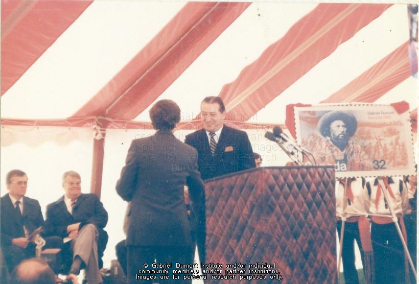 Description: In this image, Dennis Fisher shakes hands with a Canada Post employee in front of honoured guests at the ceremony honouring Gabriel Dumont. On May 6, 1985, there was a ceremony to honour Gabriel Dumont in Saskatoon. Events included the unveiling of the Gabriel Dumont stamp and first-day cover by Canada Post, the dedication of the Gabriel Dumont Statue and Park, jigging and square dancing by the Gabriel Dumont Dancers, and the official opening of the Marr Residence. This folder contains images relating to the commemoration of Gabriel Dumont during the centenary of the 1885 Resistance. This album (#12 in Dennis Fisher`s Photo Collection) centres around sculptor Bill Epp making the Gabriel Dumont statute in his studio in New Mexico; Dennis and Jean Fisher visiting Epp in his studio; the Fishers and Epp taking the statue to the Dumont family reunion in the summer of 1885; the Fishers and Epp taking the statue to Saskatoon for public display; and having it unveiled on a day of tribute to Gabriel Dumont on May 6, 1985 in Saskatoon.The Gabriel Dumont Statue was originally to be placed in the newly-created Gabriel Dumont Park; however, it permanently rests in Friendship Park in Saskatoon.