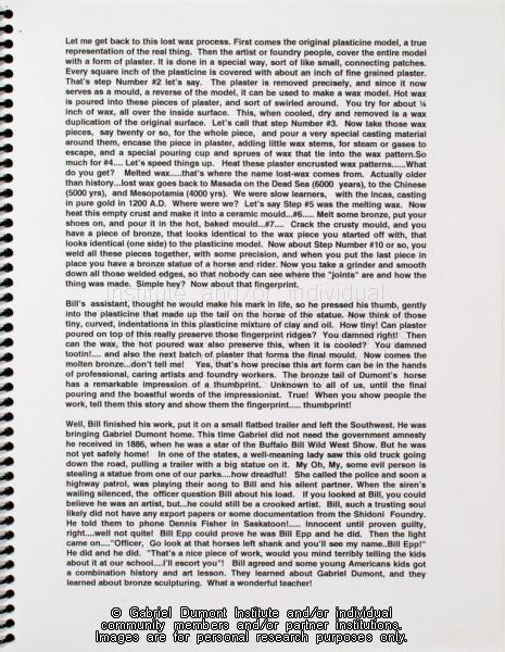 Description: In this image, Dennis Fisher writes about how a thumbprint was put on the Gabriel Dumont statue. In 1999, Dennis Fisher put together this album and entitled it the ``Gabriel Dumont Album.`` The album largely focuses on items relating to Gabriel Dumont such as Dennis and Bill Epp`s correspondence regarding the creation of the Gabriel Dumont statue, Dennis`s finding of a ``lost`` image of Gabriel Dumont at the Buffalo Bill Cody Museum in Wyoming, information relating to an image of Dumont in a Wild West show program; a document in which Dumont attempts to write his name, a chronology of Dumont`s life, a program relating to the closing of Gabriel`s Ferry, various images relating the Commemorate `85 Celebrations in Saskatoon which honoured Gabriel Dumont, as well as facsimiles of Dumont`s stamp, and a pamphlet by Agriculture Canada promoting ``Dumont Oats.`` Other items relate to Madeleine Dumont`s grave in Montana as well as information about Louis Riel including a timeline of his life, and information relating to the acquisition of his diary by Dennis Fisher and Eugène Rhéaume.