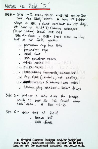 In this page from his sketchbook, Dennis Fisher outlines some of the artifacts which he his wife and their three sons found at field ``D`` on the Batoche battlefield 1968. Dennis Fisher sketched the images in the sketchbook in the late 1970s, although one image sketched in 2008. During the 1960s and `70s, Dennis and Jean Fisher and their three sons visited various archaeological sites in Saskatchewan and Montana, and collected hundreds of artifacts relating to Métis history. Overtime, Dennis, a trained draftsperson, sketched many of these finds in this sketchbook, which relate to the 1885 battlefields at Batoche and Fish Creek (Tourond`s Coulee), Gabriel (Dumont)`s Crossing near Batoche, fur trade posts at Fort Carlton at Fort Pitt, and US military forts such as Fort Assinniboine near Havre, Montana. This sketchbook is part of the Dennis and Jean Fisher Collection. This collection contains archaeological artifacts taken from the battlefields of the 1885 Resistance as well as Fort Pitt (Saskatchewan), Cumberland House (Saskatchewan), and St. Peter`s Mission, Montana. The collection also includes various artifacts and ephemera relating to the 1885 Resistance and Gabriel Dumont.