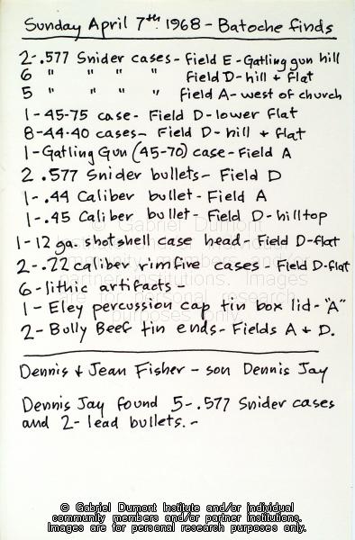 Description: In this page from his sketchbook, Dennis Fisher outlines some of the artifacts which he his wife and their three sons found on the Batoche battlefield in 1968. Dennis Fisher sketched the images in the sketchbook in the late 1970s, although one image sketched in 2008. During the 1960s and `70s, Dennis and Jean Fisher and their three sons visited various archaeological sites in Saskatchewan and Montana, and collected hundreds of artifacts relating to Métis history. Overtime, Dennis, a trained draftsperson, sketched many of these finds in this sketchbook, which relate to the 1885 battlefields at Batoche and Fish Creek (Tourond`s Coulee), Gabriel (Dumont)`s Crossing near Batoche, fur trade posts at Fort Carlton at Fort Pitt, and US military forts such as Fort Assinniboine near Havre, Montana. This sketchbook is part of the Dennis and Jean Fisher Collection. This collection contains archaeological artifacts taken from the battlefields of the 1885 Resistance as well as Fort Pitt (Saskatchewan), Cumberland House (Saskatchewan), and St. Peter`s Mission, Montana. The collection also includes various artifacts and ephemera relating to the 1885 Resistance and Gabriel Dumont.