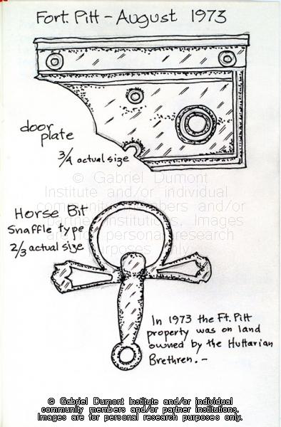 In this page from his sketchbook, Dennis Fisher sketched several artifacts that he, his wife Jean, and their sons collected at Fort Pitt in 1973. Dennis Fisher sketched the images in the sketchbook in the late 1970s, although one image sketched in 2008. During the 1960s and `70s, Dennis and Jean Fisher and their three sons visited various archaeological sites in Saskatchewan and Montana, and collected hundreds of artifacts relating to Métis history. Overtime, Dennis, a trained draftsperson, sketched many of these finds in this sketchbook, which relate to the 1885 battlefields at Batoche and Fish Creek (Tourond`s Coulee), Gabriel (Dumont)`s Crossing near Batoche, fur trade posts at Fort Carlton at Fort Pitt, and US military forts such as Fort Assinniboine near Havre, Montana. This sketchbook is part of the Dennis and Jean Fisher Collection. This collection contains archaeological artifacts taken from the battlefields of the 1885 Resistance as well as Fort Pitt (Saskatchewan), Cumberland House (Saskatchewan), and St. Peter`s Mission, Montana. The collection also includes various artifacts and ephemera relating to the 1885 Resistance and Gabriel Dumont.