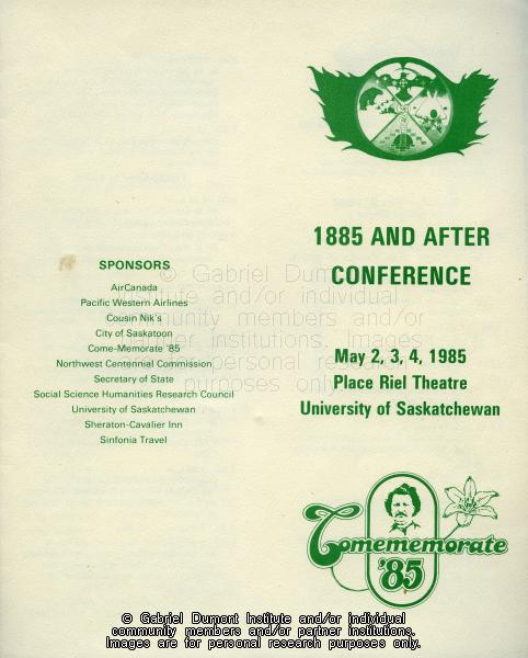 | Description: | This image is of a pamphlet for the 1885 and After Conference that was held on May-4, 1985 at the University of Saskatchewan.