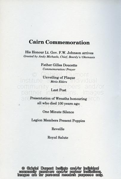 Description: This image is a scan of an inside page of a Saskatchewan Remembers North West Centennial, 1885-1985, `First Shots Commemoration Duck Lake, March 22-23, 1985 pamphlet. This item is part of the Dennis and Jean Fisher Collection. This collection contains archaeological artifacts taken from the battlefields of the 1885 Resistance as well as Fort Pitt (Saskatchewan), Cumberland House (Saskatchewan) and St. Peter’s Mission, Montana. The collection also includes various artifacts and ephemera relating to the 1885 Resistance and Gabriel Dumont.