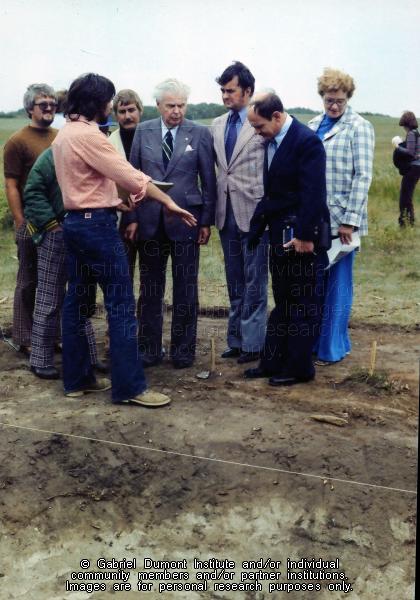 Description: This series of photographs was taken by Dennis Fisher in August 1977 and focuses on the visit of the former Prime Minister of Canada, the Right Honourable John G. Diefenbaker and MP Ray Hnatyshyn (later the Governor General) to an archaeological dig at Batoche. The following were the main people present in the photographs: John Diefenbaker (grey suit with white hanky, shirt and tie), Ray Hnatyshyn (light grey jacket, blue shirt), Paul F. Donahue, archaeologist (pink shirt, black pants), Valerie J. Hall, archaeologist (dark hair, blue zippered jacket), Mable Simpson, Parks Canada employee (blue slacks, checked jacket), Terry ?, Parks Canada archaeologist (beard, checked shirt), Wild Weber and Gary Von Kuster (newsmen and TV photographer) and and Edward Bruce, Parks Canada, Batoche Custodian (brown suit). This collection contains archaeological artifacts taken from the battlefields of the 1885 Resistance as well as Fort Pitt (Saskatchewan), Cumberland House (Saskatchewan) and St. Peter’s Mission, Montana. The collection also includes various artifacts and ephemera relating to the 1885 Resistance and Gabriel Dumont.