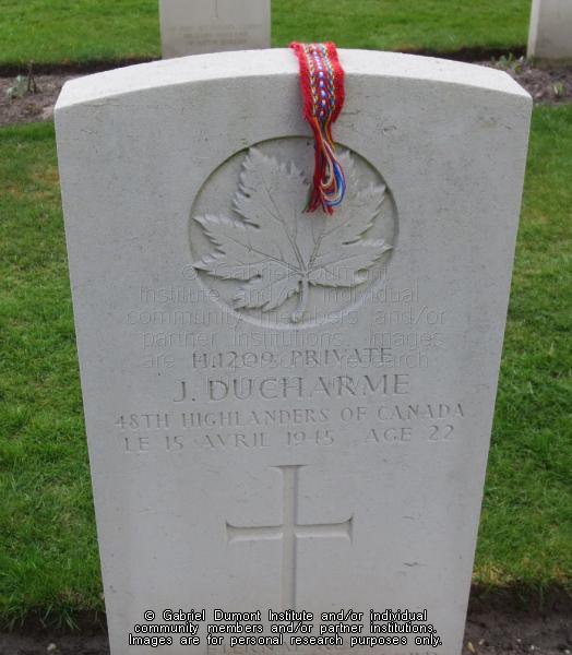 Gravestone of John Ducharme, H.1209 Private, 48th Highlanders of Canada. Died April 15, 1945. Age 22. Inscription reads, "Eternal Rest..." Son of Pascal and Virginia Ducharme, of The Pas, Manitoba. |