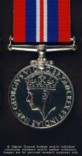 | Description: | This image is of David Henry Carriere's War Medal 1939-1945, which was given to him for serving in the Canadian Army during the Second World War. According to Victor Demas Carriere, who granted the Gabriel Dumont Institute permission to photograph this image, his father David Henry Carriere (1921-1987) was only 17 when he joined the Canadian Army. David enlisted because his older brother Frank had signed up and he did not want is brother to go to war by himself.