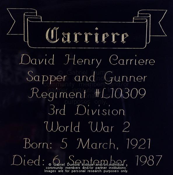 | Description: | This image is of a biographical plaque of David Henry Carriere (1921-1987), a veteran of the Second World War. According to Victor Demas Carriere, who granted the Gabriel Dumont Institute permission to photograph this image, his father David Henry Carriere was only 17 when he joined the Canadian Army. David enlisted because his older brother Frank had signed up and he did not want is brother to go to war by himself.
