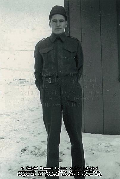 | Description: | This is image is of Harold Lajimodiere (1922-2000) who served with the Essex Scottish Regiment of the Canadian Army during the Second World War. Originally from the Estevan, Saskatchewan area, his parents were Marceline Blondeau and Albert Lajimodiere. His great-grandparents were Jean-Baptiste Lagimodière and Marie-Anne Gadboury—Louis Riel’s maternal grandparents. Harold Lajimodiere was involved in the organization of Métis veterans in Saskatchewan before he passed away in 2000.