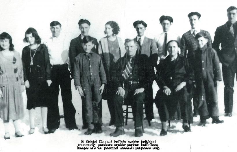 | Description: | This photograph is of Frédéric and Exerine (née Lejour) Dumont’s family in 1935. Back row, right to left, oldest child to the youngest: Norman Raymond, Eugene Victor, Albert, Evariste Alexandre, Marie Cecile, Lawrence James (father of Mavis Dumont), Samuel Logan, Emma Stella, Mary Theresa. Front row, right to left: William Allen, Marie Zepherine (aka Exerine) Dumont (née Lejour), August, Frédéric. Frédéric was the son of Isadore (Cha-pi-to-la-ta) and Judith (née Parenteau) Dumont. This image was donated by Mavis Dumont |
