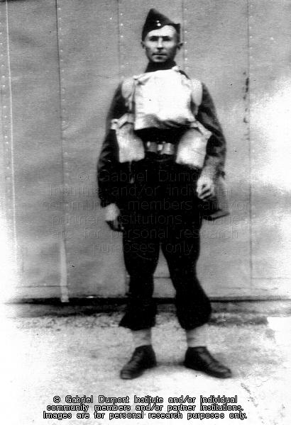 This is an image of Private Edmond Joseph Boyer (1898-1966) who served briefly in both the First and Second World Wars. This photograph is from the Second World War. Edmond was from Batoche, Saskatchewan. This image was donated to the Institute by Brenda (Boyer) Percell. The original source of this image is Estelle Boyer. Edmond was Brenda’s grandfather. This image must not be reproduced. |