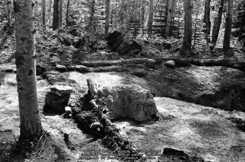 | Description: | This image is a photograph of the Kajewski site, Métis hivernant (``winterer``) cabins near Elkwater, Alberta. The site is in the Cypress Hills and this particular image was photographed in 1967 by Robson Bonnichsen.