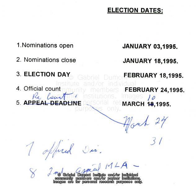 | Title: | Notice, Various Métis Nation of Saskatchewan Election Dates, 1995 |