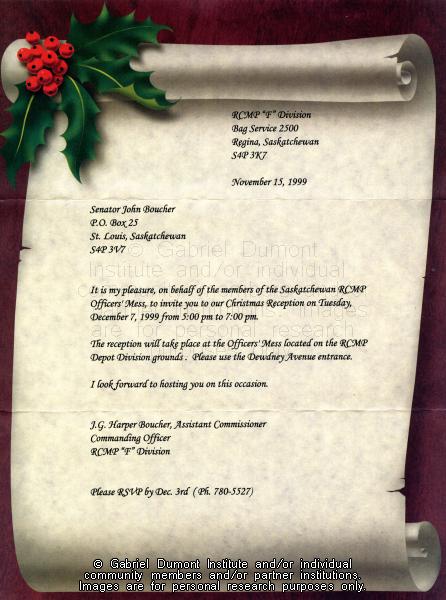 | Description: | This document is a letter inviting John Boucher to a RCMP Christmas party. |