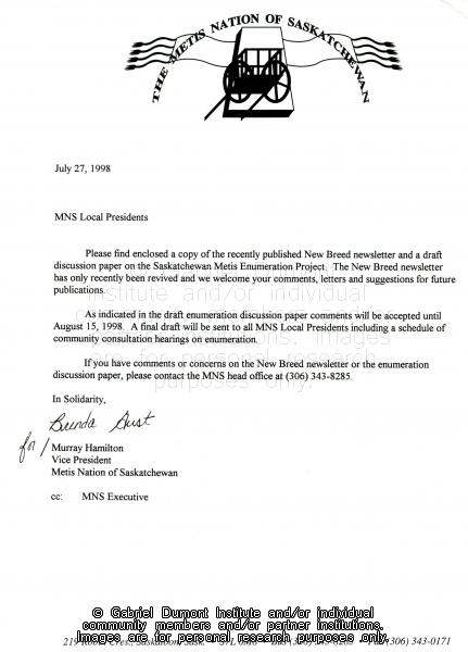 | Description: | This document is a letter by Métis Nation of Saskatchewan Vice President Murray Hamilton regarding the Métis Enumeration Project and New Breed Magazine. |