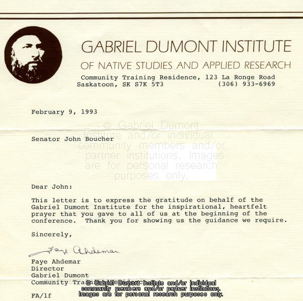 This document is a thank you letter from Gabriel Dumont Institute Training and Employment to John Boucher, thanking him for his prayer at a conference. |
