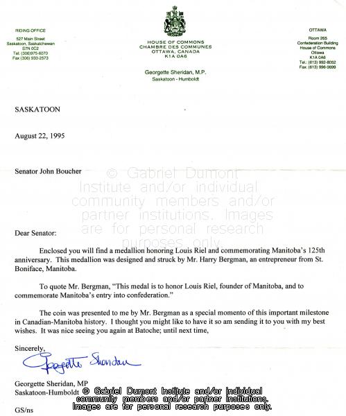 | Description: | This document is a letter from MP Georgette Sheridan to John Boucher, regarding a gift of a Louis Riel coin. |