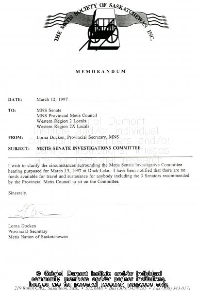| Title: | Memorandum, Métis Nation of Saskatchewan to MNS Senate, MNS Provincial Métis Council... |