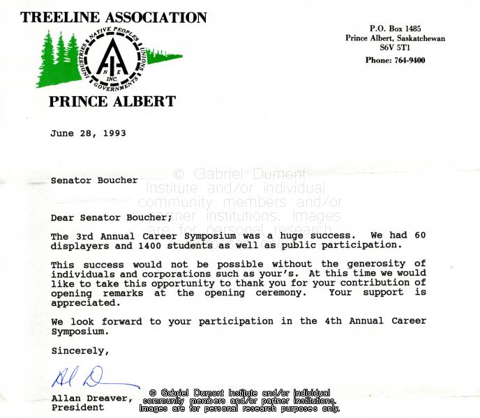 | Title: | Letter, Treeline Association of Prince Albert to John Boucher |
