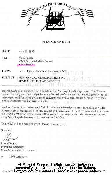 | Title: | Memorandum, Docken, Lorna to Métis Nation of Saskatchewan Locals, Provincial Métis Council, Senate |
